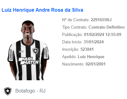 Após o Botafogo anunciar a contratação do atacante Luiz Henrique, na manhã desta quinta-feira (01), o nome do jogador foi publicado no Boletim Informativo Diário (BID) da CBF e o novo reforço do Glorioso já está liberado a entrar em campo. O contrato em definitivo será válido até dezembro de 2028.