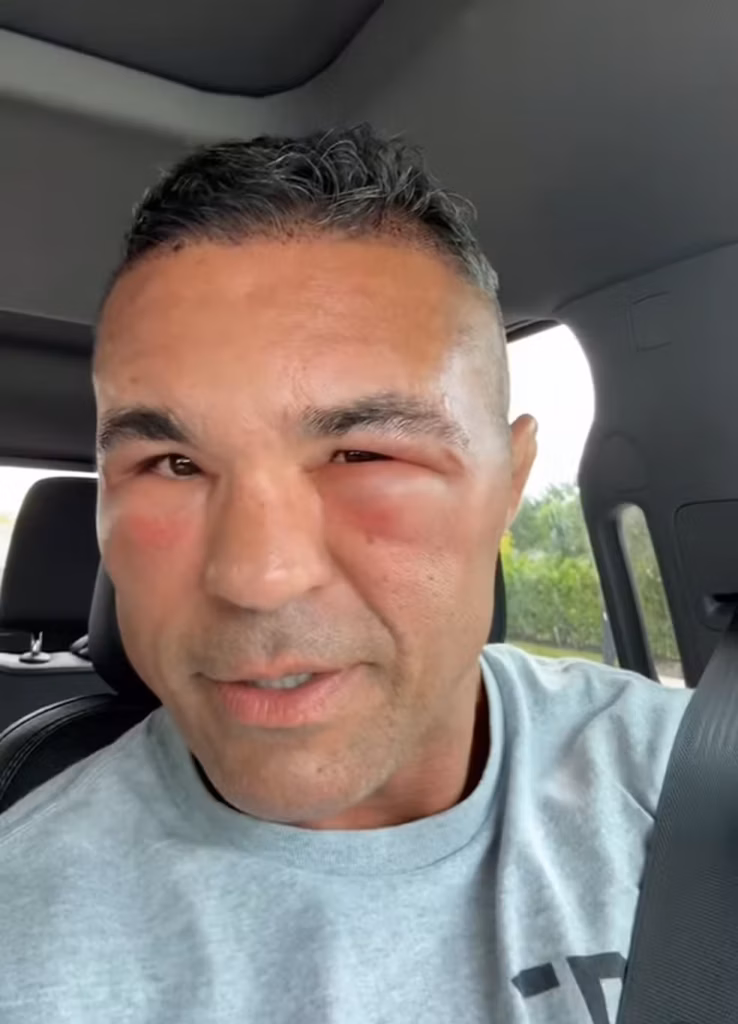 O lutador brasileiro Vitor Belfort apareceu neste sábado (18) com inchaços ao redor dos olhos. Um mês após ser forçado a desistir da revanche contra Wanderlei Silva no Spaten Fight Night por conta de uma concussão sofrida nos treinos.