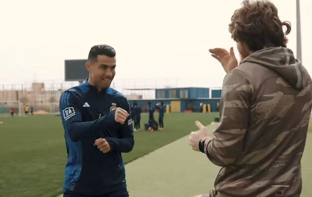Assim que encontrou Cristiano Ronaldo no CT, Shara Bullet se empolgou e “atacou” o jogador com um single leg.