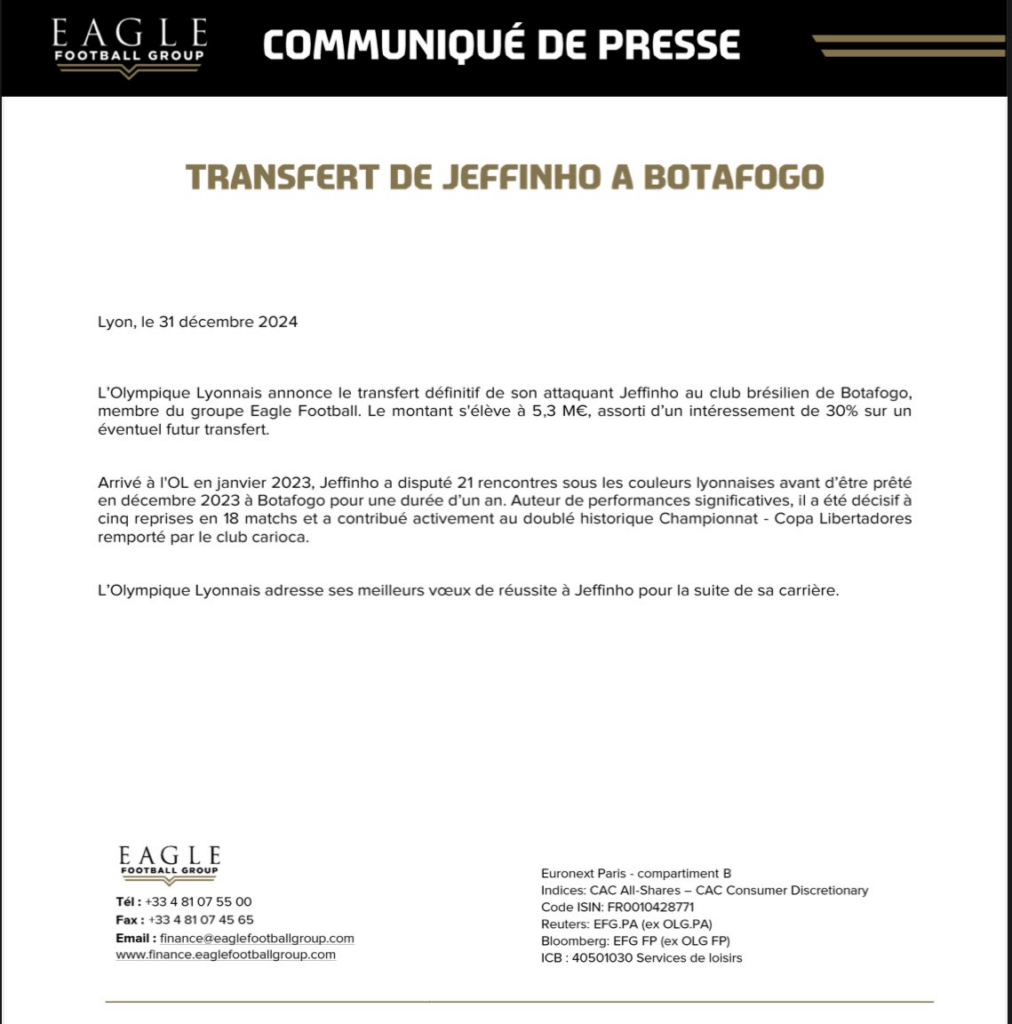 “O Olympique Lyonnais anuncia a transferência definitiva de seu atacante Jeffinho para o clube brasileiro Botafogo, membro do grupo Eagle Football. O valor foi de 5,3 milhões de euros, com acréscimo de 30% sobre uma eventual transferência futura.