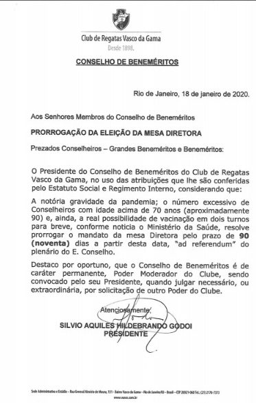 O argumento apresentado por Silvio Godoi é que muitos membros do Conselho de Beneméritos do Vasco tem mais de 70 anos. Consequentemente, seria grande o risco de contágio da Covid-19 no processo eleitoral, a ser realizado presencialmente. Confira abaixo o ofício que determina a prorrogação: