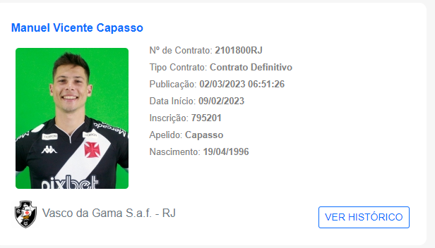 O zagueiro Manuel Capasso teve seu nome publicado no Boletim Informativo Diário da CBF e está liberado para atuar pelo Vasco. O zagueiro argentino já treina com os novos companheiros e agora fica na expectativa para ser utilizado pelo técnico Maurício Barbieri no clássico contra o Flamengo, no próximo domingo, às 18h10, no Maracanã.