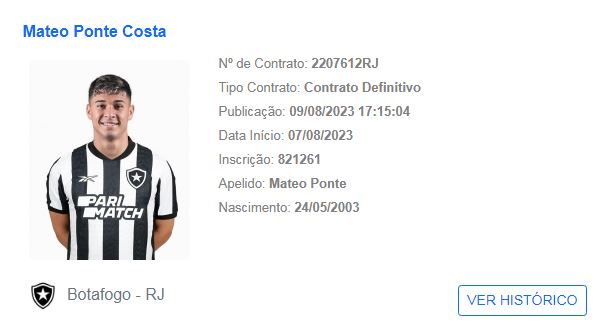 O técnico Bruno Lage ganhou uma opção para a lateral-direita. O nome do lateral-direito Mateo Ponte foi publicado no BID (Boletim Informativo Diário) da CBF nesta quarta-feira (09). Regularizado, o uruguaio está liberado para estrear no próximo sábado contra o Internacional pelo Campeonato Brasileiro.