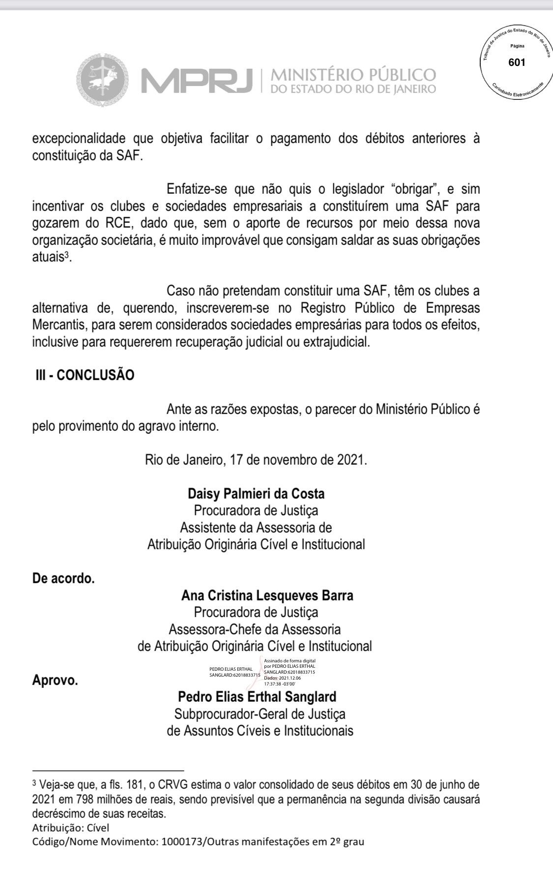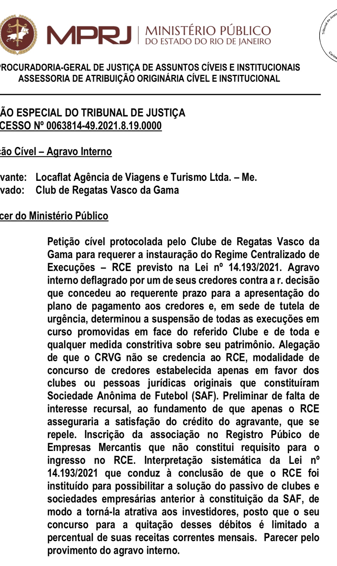 Nesta quarta-feira (15/12), o Ministério Público do Rio de Janeiro, MPRJ, acatou um agravo contra os pedidos do Vasco da Gama em favor da empresa Locaflat Agência de Viagens Ltda. Um documento de 15 páginas foi divulgado pelo MPRJ. Estamos publicando a primeira e última páginas onde temos o parecer do órgão público: