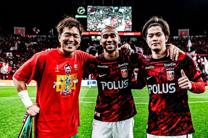 Thiago Santana (meio) é reserva ‘de luxo’ do Urawa Reds – Foto: Reprodução/Instagram