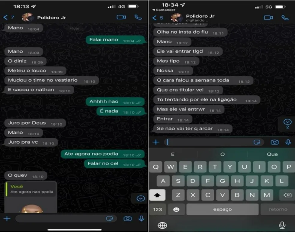 Na sequência, afirmam que se ele não entrar no jogo “vai ter que arcar” com o prejuízo dos apostadores. E de fato o meia não entrou na partida. No diálogo, em determinado momento, o treinador iria chamar Nathan, mas optou por Martinelli, o que resultou em mais um xingamento ao técnico tricolor. O time de Fernando Diniz venceu a partida por 2 a 1.