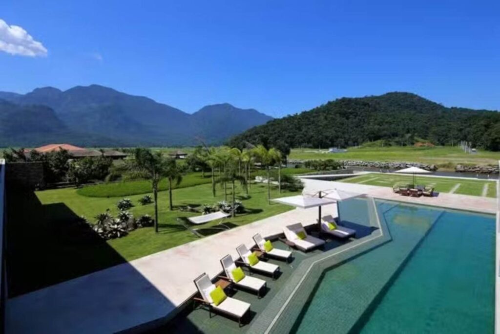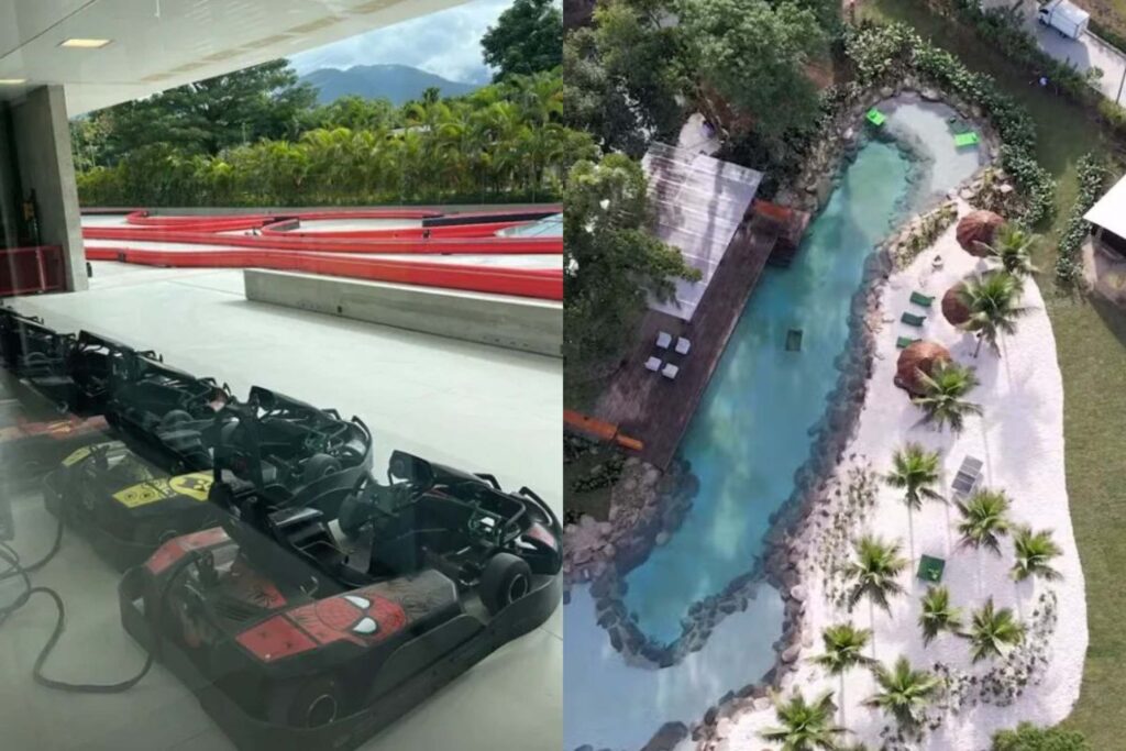 A segunda propriedade, no condomínio Aero Rural, ocupa um terreno de 10 mil metros quadrados. Com um lago artificial, pista de kart, campo de futebol de areia e três piscinas, a casa é voltada para uma integração com a natureza. Além disso, conta com uma estrutura para transporte e esportes náuticos, incluindo um heliponto particular e uma marina com capacidade para três lanchas.