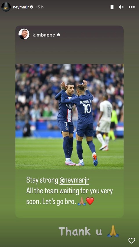 Nas redes sociais, Neymar lamentou a lesão: ‘De novo e de novo’ – disse, em inglês. Companheiro de clube, Mbappé desejou forças ao brasileiro. ‘Fique forte. Toda a equipe está esperando por você em breve. Vamos, irmão.’ – declarou o francês.