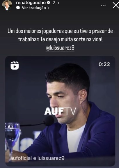 Parceiros no Grêmio ao longo de toda a temporada de 2023, o técnico Renato Portaluppi fez questão de escrever bonitas palavras para Suárez nesta semana via rede social. “Um dos maiores jogadores que eu tive o prazer de trabalhar. Te desejo muita sorte na vida, Luis Suárez!”, postou.