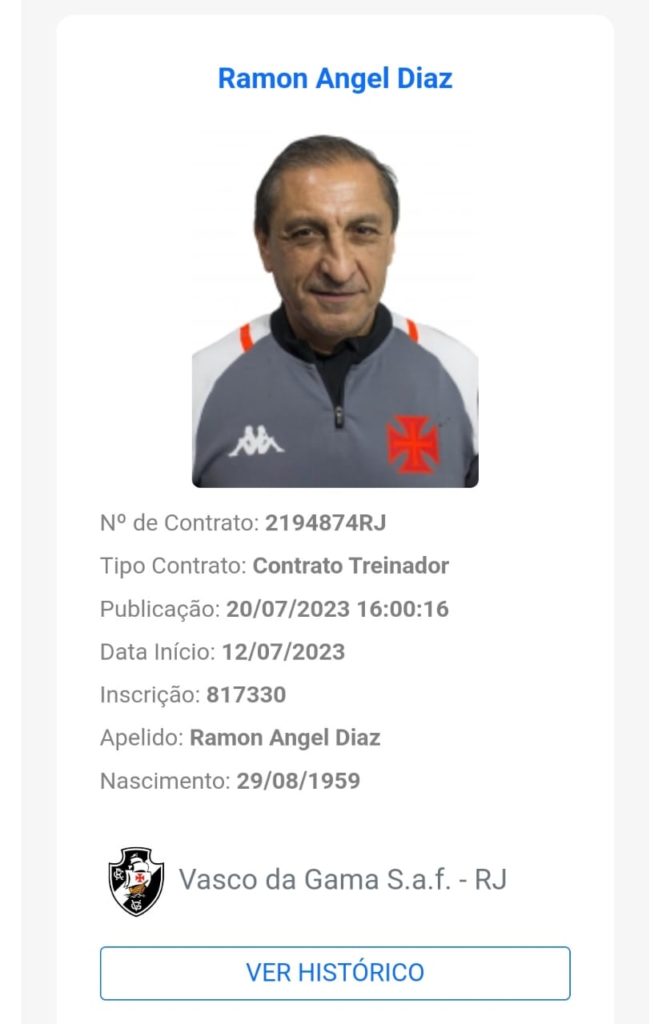 Na tarde desta quinta-feira (20), o Vasco anunciou a regularização do técnico Ramon Díaz. Com o nome publicado no BID (boletim informativo da CBF), o treinador poderá comandar a equipe no duelo com o Athletico-PR, no próximo domingo.