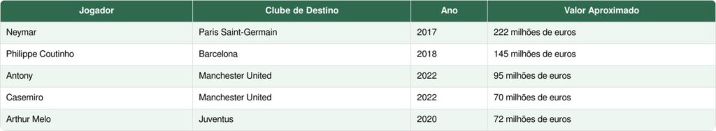 Nesse cenário, muitos jogadores brasileiros se tornaram peças desejadas por grandes clubes. Jovens promessas e atletas consagrados passaram a protagonizar negociações que entraram para a história do futebol.