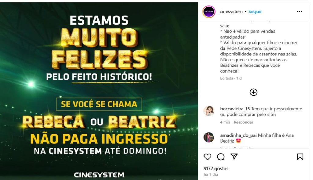 Segundo post da rede de cinemas, quem se chamar Rebeca ou Beatriz terá direito a retirar um ingresso gratuitamente, para qualquer sessão de cinema em todos os estados em que a Cinesystem está presente.