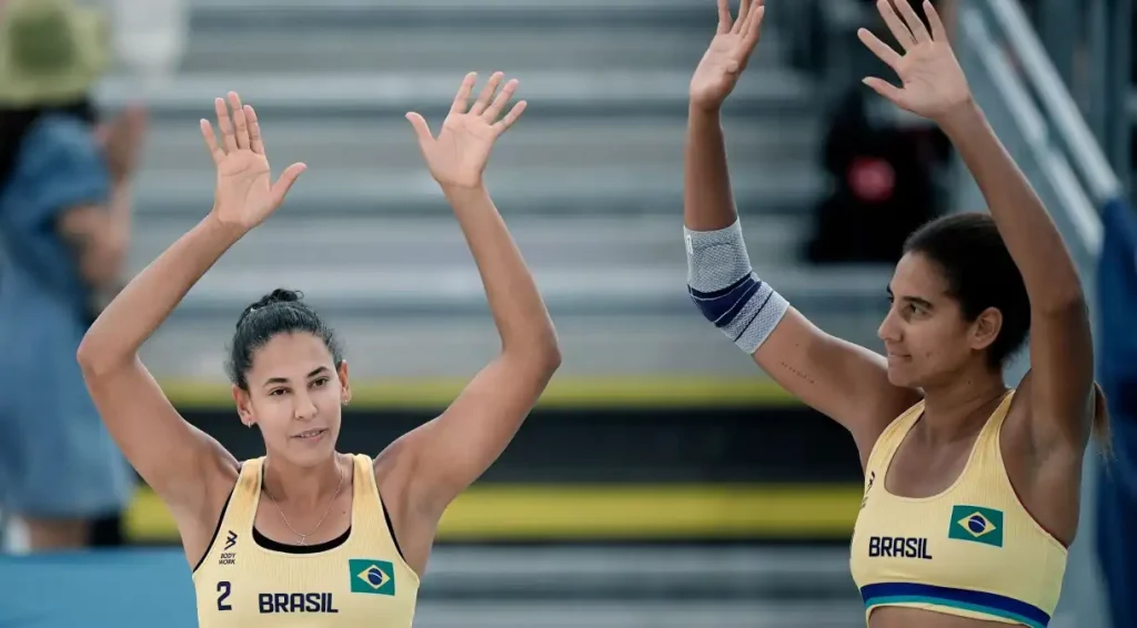 As atletas do Brasil derrotaram as adversárias por 2 sets a 0, parciais de 21/16 e 21/11.