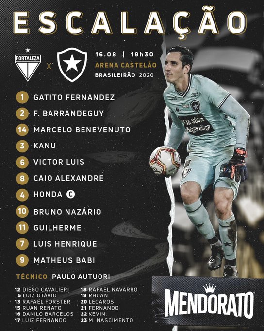 O Botafogo está escalado para enfrentar o Fortaleza, em partida válida pela terceira rodada do Campeonato Brasileiro. Ainda sem a presença de Pedro Raul, o glorioso continua com Matheus Babi no comando de ataque.  A novidade fica por conta de Guilherme Santos, que fez uma boa partida contra o Bragantino e ganhou a vaga na equipe titular.