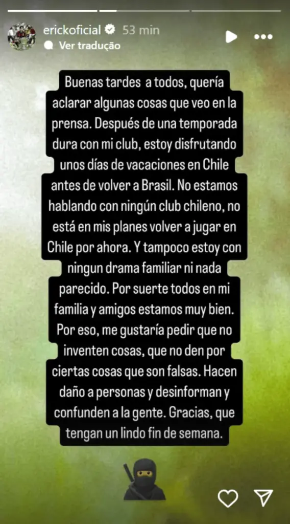 “Boa tarde a todos, queria esclarecer algumas coisas que vi na imprensa. Depois de uma temporada dura com o meu clube, estou desfrutando de dias de férias no Chile antes de voltar ao Brasil. Não estamos falando com nenhum clube chileno, não está nos meus planos voltar a jogar no Chile por agora. E, tampouco, estou com algum drama familiar ou algo parecido. Por sorte todos em minha família e amigos estão muito bem”, escreveu, nos stories do Instagram, aproveitando para fazer um pedido.