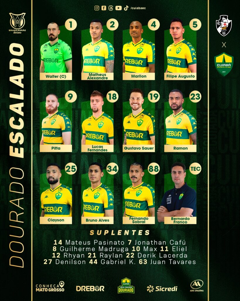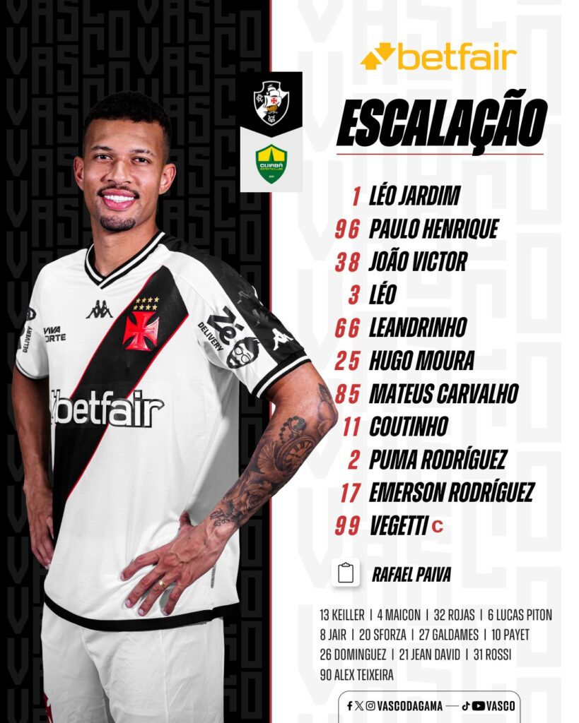 O técnico Rafael Paiva definiu o time titular do Vasco para o jogo contra o Cuiabá, na noite desta quinta-feira (24), às 19h, em São Januário. A bola rola em duelo atrasado da 19ª rodada do Campeonato Brasileiro. A escalação conta com a base que atuou no empate em 1 a 1 com o Atlético-MG, pela partida de volta das semifinais da Copa do Brasil.