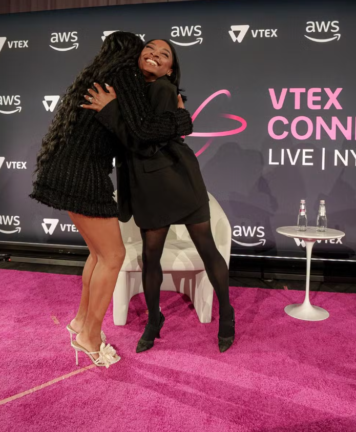 Rebeca Andrade e Simone Biles se reuniram em Nova York para palestrar no evento VTex Connect, inspirando o público com suas trajetórias.
