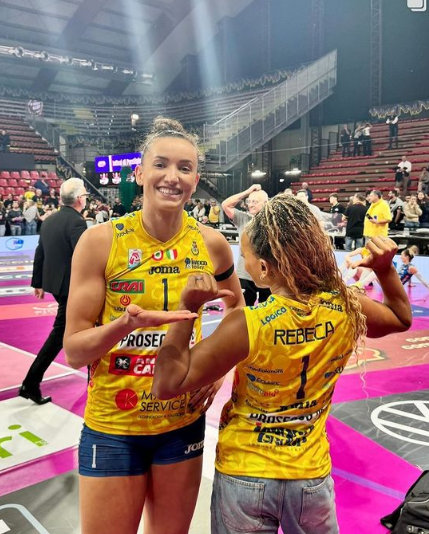 Rebeca não deixou o Pala Barton, ginásio que recebeu o confronto em Perugia, de mãos vazias. Ao fim da partida, recebeu das mãos de Gabi uma camisa do Conegliano que leva o nome dela e o número 1 da ponteira.