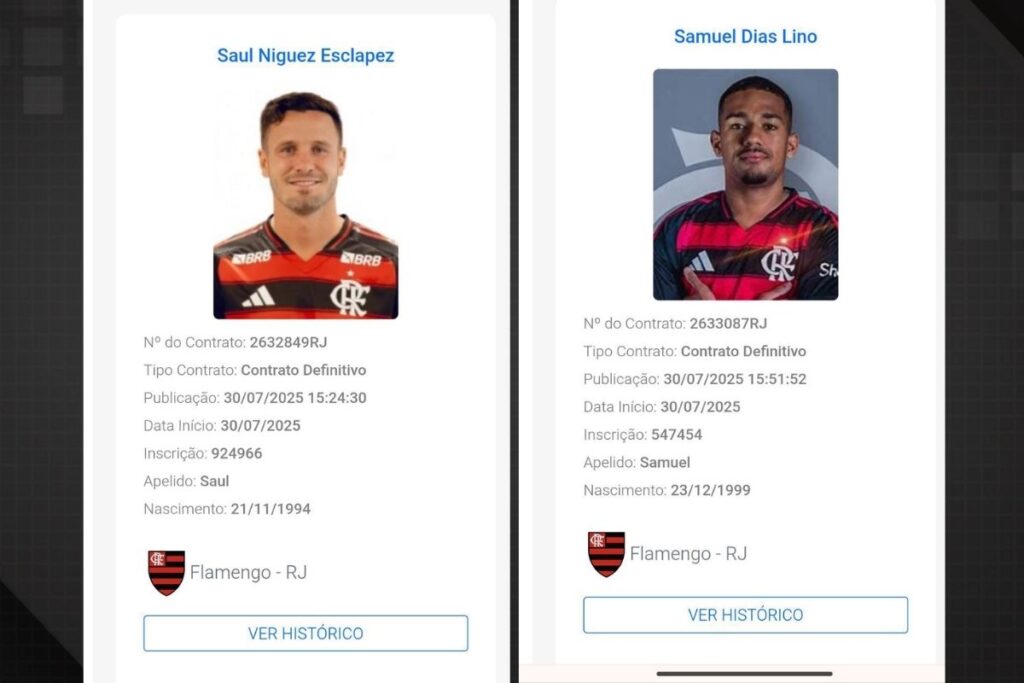 O Flamengo registrou dois de seus novos reforços. A Confederação Brasileira de Futebol publicou os contratos de Saúl Ñíguez e Samuel Lino no Boletim Informativo Diário (BID) desta quarta-feira. Assim, os dois atletas já podem entrar em campo com a camisa rubro-negra. No entanto, ambos ainda passarão por um período de treinamentos, já que não atuam oficialmente há algumas semanas.