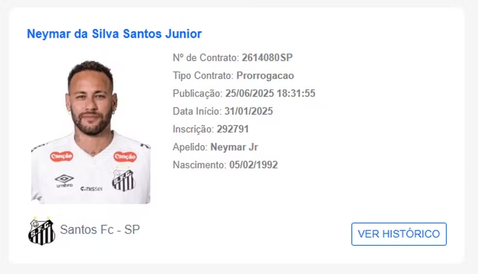 A renovação de contrato de Neymar com o Santos está oficialmente no Boletim Informativo Diário (BID) da Confederação Brasileira de Futebol (CBF). O jogador, que tinha vínculo até o meio do ano, agora passa a ter o acordo ampliado por mais seis meses. Ou seja, o camisa 10 poderá disputar todo o Campeonato Brasileiro de 2025 pelo Peixe.