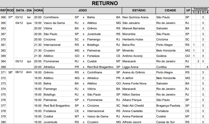 Já a última rodada, como de praxe, será toda ela disputada ao mesmo tempo, no dia 8, às 16h. A CBF, no entanto, deixou aberta a possibilidade de jogos que não estiverem valendo título, rebaixamento ou vagas nas competições internacionais serem antecipadas para o dia 7.
