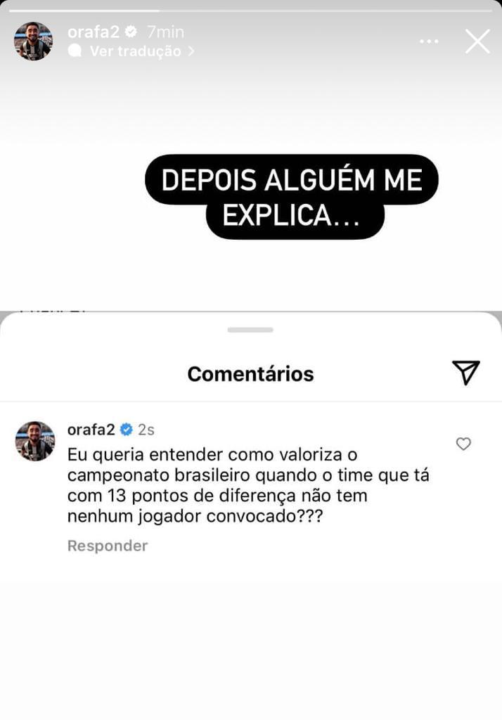 – Eu queria entender como valoriza o Campeonato Brasileiro quando o time que tá com 13 pontos de diferença não tem nenhum jogador convocado??? – postou o atleta no Instagram