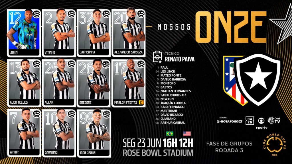 Nesta segunda-feira (23), o Botafogo enfrenta o Atlético de Madrid às 16h, no Rose Bowl Stadium, pela terceira rodada da fase de grupos da Copa do Mundo de Clubes. O técnico Renato Paiva vai repetir o time que venceu o PSG por 1 a 0.