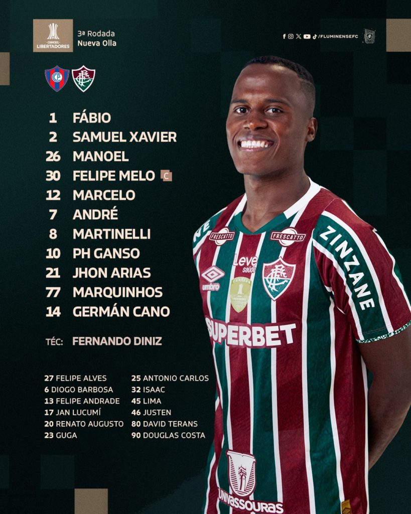 Nesta quinta-feira (25), o Fluminense encara o Cerro Porteño, às 19h, em Assunção, no Paraguai, pela terceira rodada da fase de grupos da Libertadores sem mudanças em relação ao jogo do último sábado (20) contra o Vasco. Os únicos desfalques são John Kennedy, Alexsander, Kauã Elias e Arthur afastados por indisciplina.