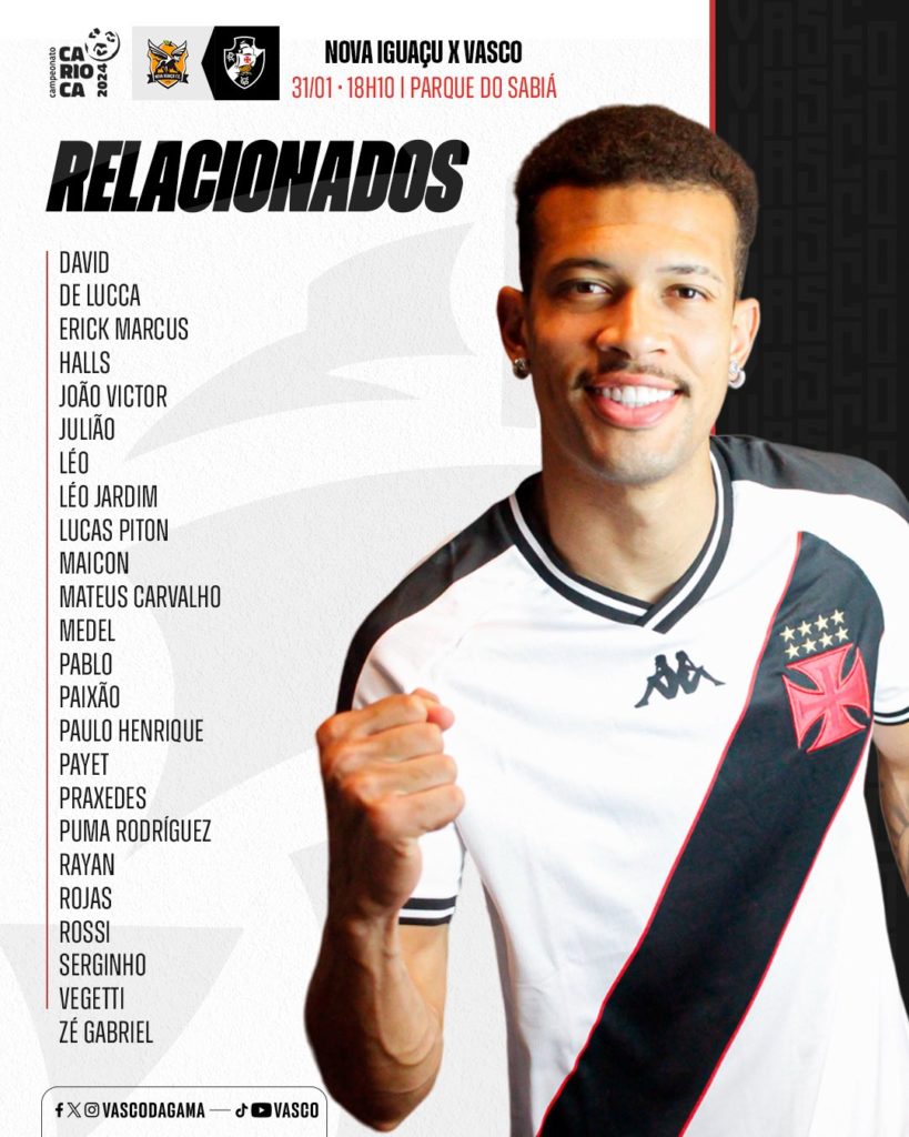 Sem Paulinho e Jair, Vasco divulga lista de relacionados para encarar o Nova Iguaçu