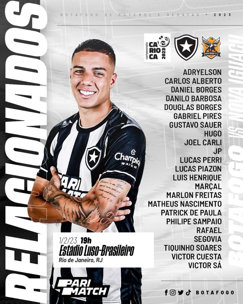 O Botafogo divulgou a lista de relacionados para o confronto diante do Nova Iguaçu, nesta quarta-feira, às 19h10, no Luso Brasileiro, pela sexta rodada do Campeonato Carioca. Em tratamento, o meia Tchê Tchê está fora da relação e desfalca a equipe.