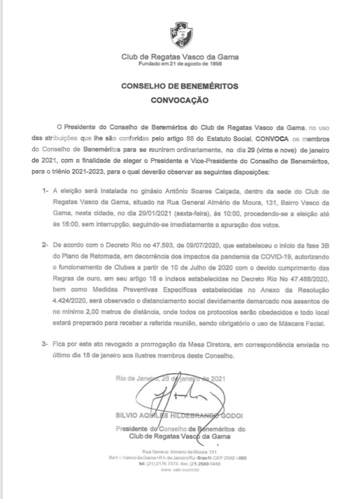 Silvio Godoi convoca eleição presencial para o Conselho de Beneméritos do Vasco