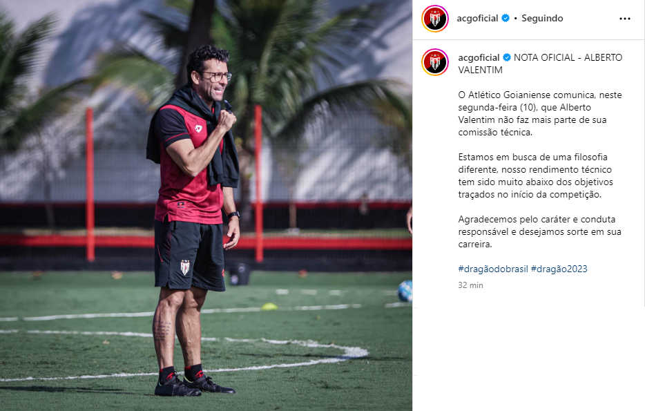 TÁ FORA! Atlético-GO anuncia a demissão do técnico Alberto Valentim