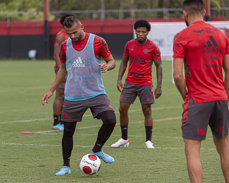 A volta de Thiago Maia aos gramados está mais próxima. O volante já treina em campo com os demais companheiros de Flamengo, inclusive em atividades com bola, e está na reta final da recuperação do corte sofrido na perna esquerda no começo da última semana. As poucas restrições ficam nos impactos com os demais atletas uma proteção específica na região.