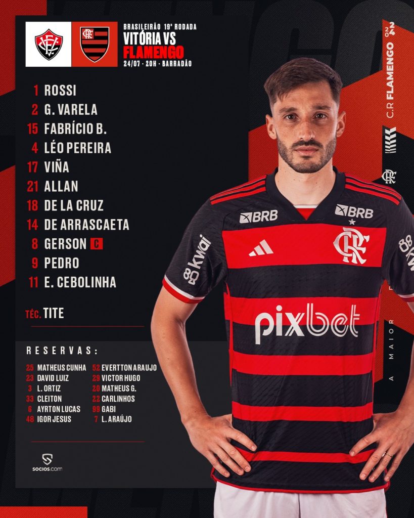 O Flamengo está pronto para enfrentar o Vitória, no Barradão, às 20h. Com um sistema defensivo praticamente todo novo, Tite escalou o time que vai tentar se reaproximar do Botafogo na liderança do Campeonato Brasileiro.
