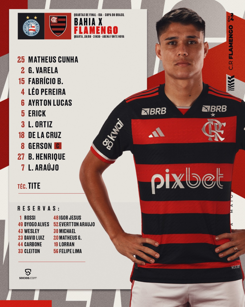 O Flamengo está definido para enfrentar o Bahia pelo jogo de ida das quartas de final da Copa do Brasil. Com apenas uma mudança significatva no time titular, Tite colocou força máxima na partida fora de casa.