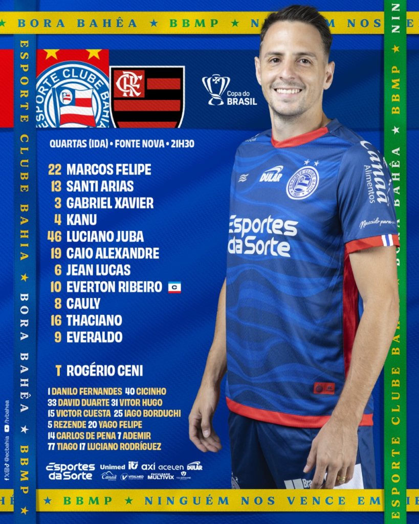 O Bahia também vai com o mesmo time que enfrentou o Botafogo, com força máxima. Éverton Ribeiro vai enfrentar o Flamengo pela primeira vez na Arena Fonte Nova. No primeiro confronto desde que chegou ao Bahia, no Maracanã, o Rubro-negro venceu por 2 a 1 com gol no último lance de David Luiz.