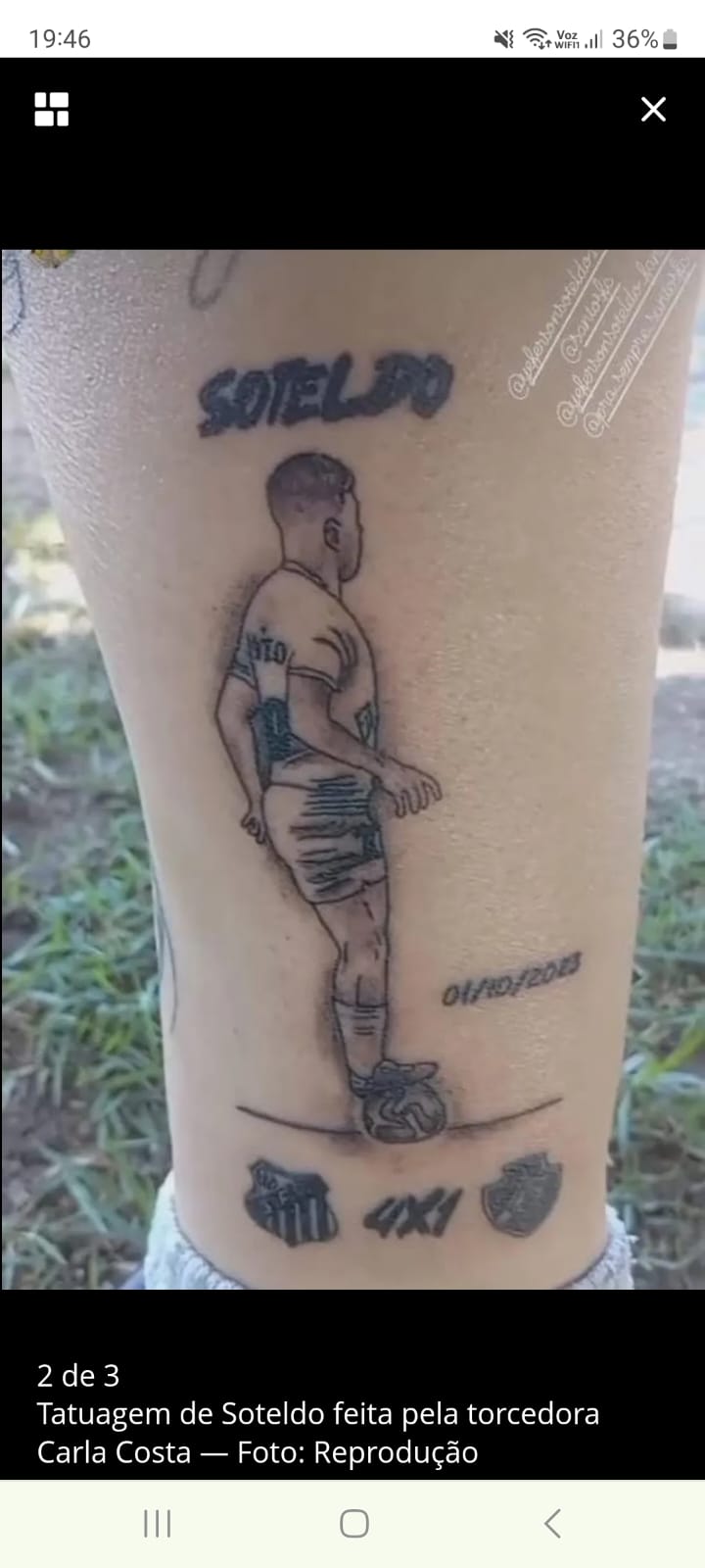 O lance polêmico do jogador Soteldo do Santos que subiu na bola em pleno Santos e Vasco realizado na Vila Belmiro e que foi considerada uma cena de provocação por alguns críticos e que acabou sendo transformado em desenho foi tatuado pela torcedora fanática do Santos Carla Cabral Costa.