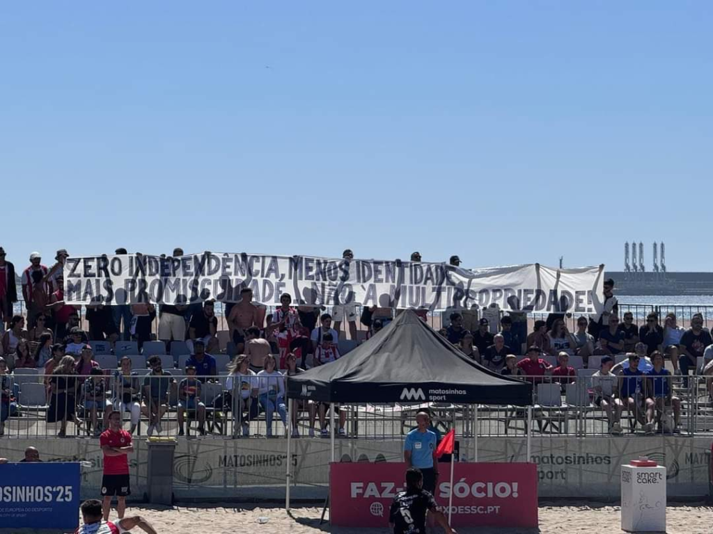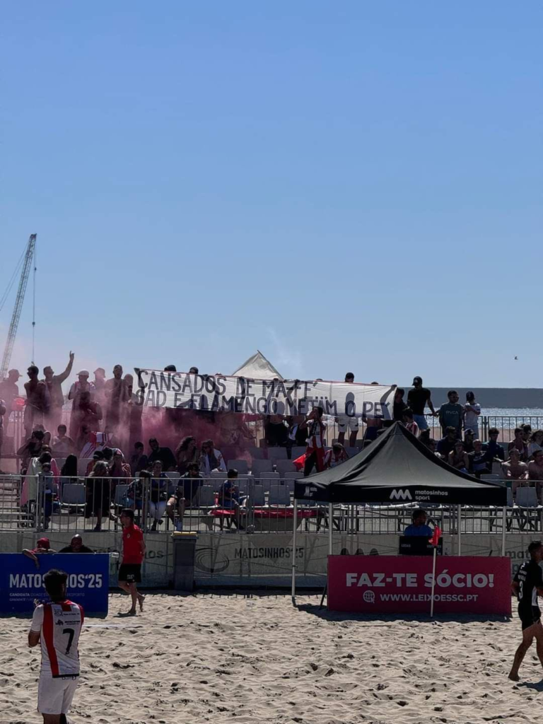 A torcida do Leixões, clube de Portugal, aproveitou um confronto no futebol de areia contra o Nazaré, em Matosinhos, no último sábado (20), para protestar contra a negociação da diretoria da equipe portuguesa com o Flamengo para a venda do futebol aos cariocas.