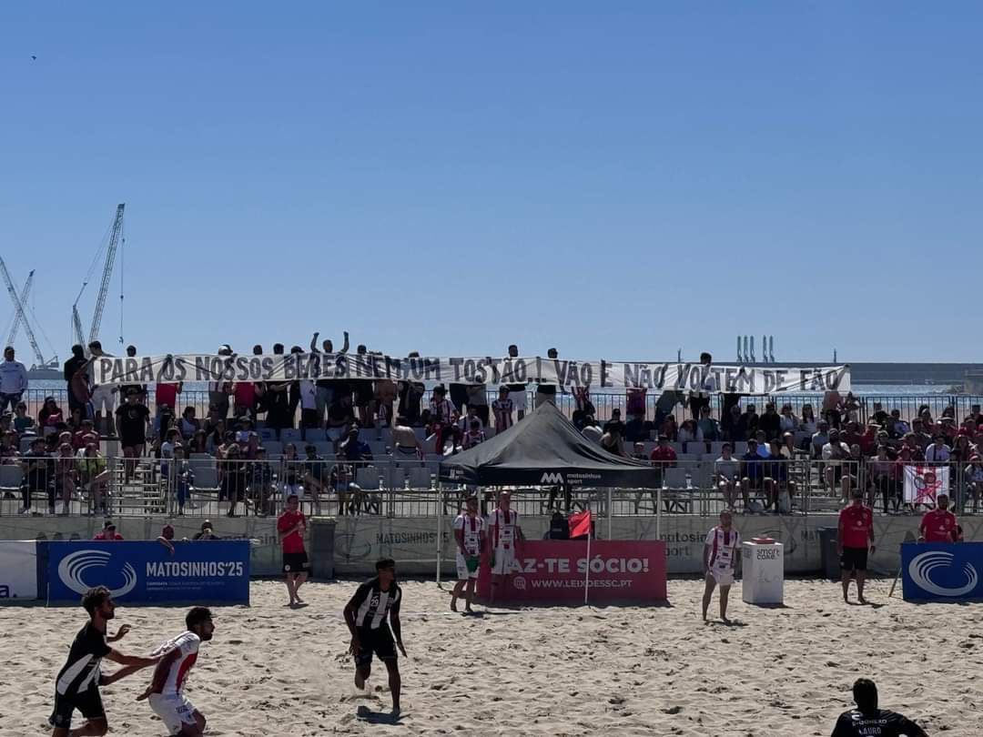 A torcida do Leixões, clube de Portugal, aproveitou um confronto no futebol de areia contra o Nazaré, em Matosinhos, no último sábado (20), para protestar contra a negociação da diretoria da equipe portuguesa com o Flamengo para a venda do futebol aos cariocas.
