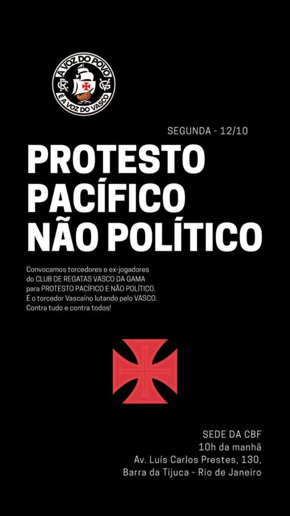 Os torcedores do Vasco da Gama estão convocados para um protesto pacífico, não político, para está segunda-feira (12/10), às 10 horas na porta da CBF para marcar posição quanto aos erros de arbitragem nos jogos do campeonato brasileiro.