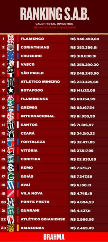 Mais de 246 mil torcedores participam da campanha, que garante repasses integrais aos clubes, incluindo times da Série A e B do Campeonato Brasileiro. De acordo com os dados divulgados, o Flamengo lidera a arrecadação, com R$ 948.458,84, seguido por Corinthians, Cruzeiro, Vasco e São Paulo. Atlético Mineiro, Botafogo, Fluminense, Grêmio e Internacional completam o top 10.