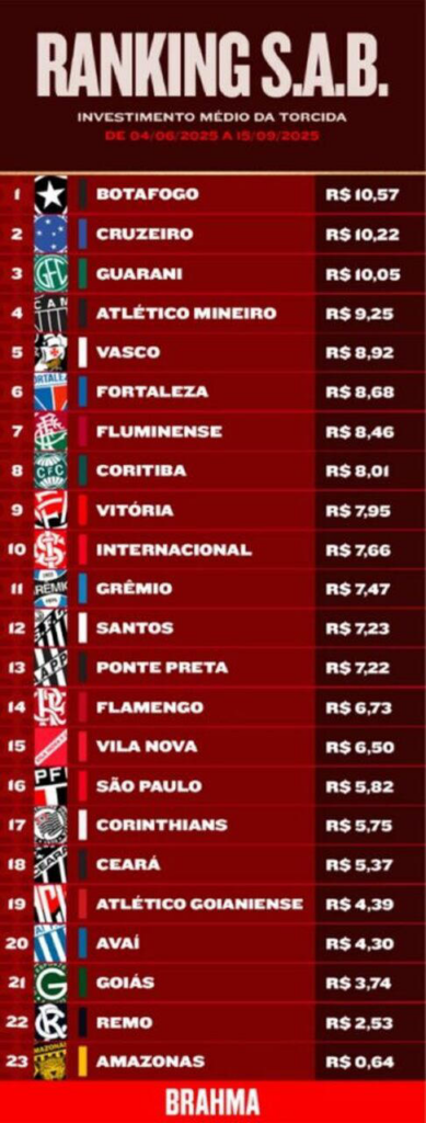Já no quesito engajamento médio, a torcida do Botafogo se destaca: os alvinegros investiram, em média, R$ 10,57 por participante, totalizando R$ 141.122,05 e ocupando a sétima posição na tabela geral. A campanha também mostra forte participação de torcedores de clubes da Série B, como Remo, Coritiba, Goiás, Avaí, Vila Nova, Ponte Preta, Guarani, Atlético Goianiense e Amazonas, que figuram entre os 23 times com mais interações.