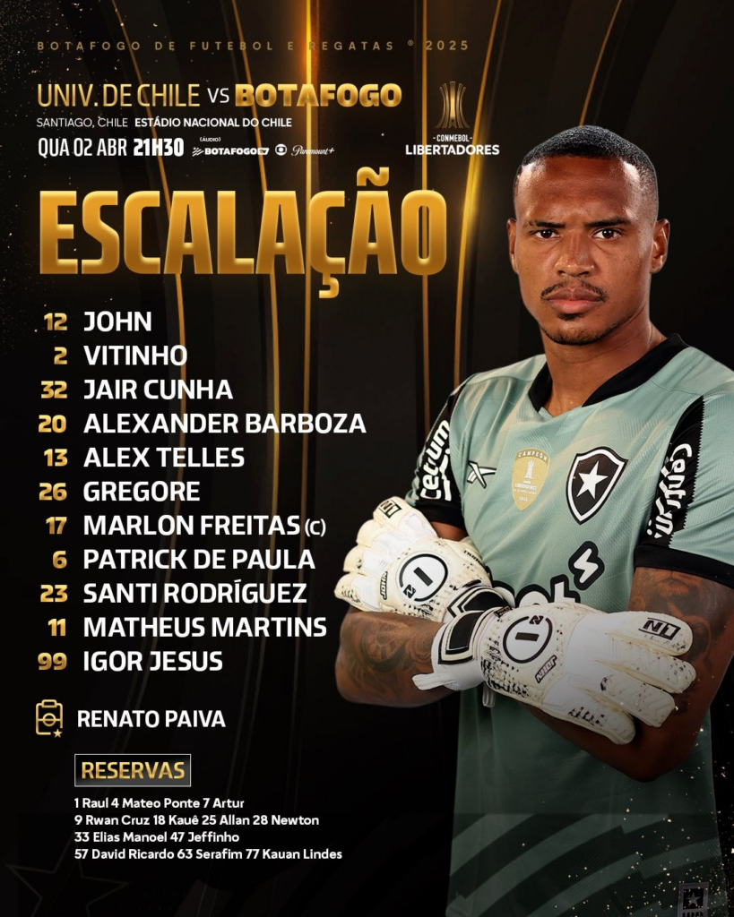 O Botafogo está escalado para enfrentar a Universidad do Chile, pela estreia da Libertadores. Renato Paiva dá indícios de rodagem do time titular com Santi Rodríguez e Matheus Martins no 11 inicial.