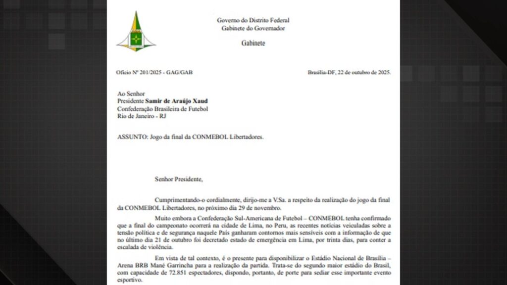 O governador do Distrito Federal, Ibaneis Rocha (MDB), tenta levar a final da atual edição da Libertadores para a capital federal. Nesta quarta-feira (22), ele enviou um ofício para Samir Xaud, presidente da CBF, oferecendo a cidade.
