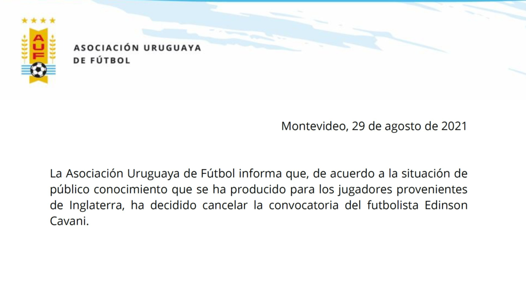 O primeiro por conta da restrição imposta pela Premier League, de não liberar atletas para viajaram para países que estão na lista vermelha do Reino Unido. Os outros dois acabaram se lesionando em partidas do final de semana. Óscar Tabárez convocou os atacantes Agustín Álvarez Martínez, do Peñarol, e Federico Martínez, do Liverpool-URU, e o veterano zagueiro e lateral Martín Cáceres, que está sem clube.