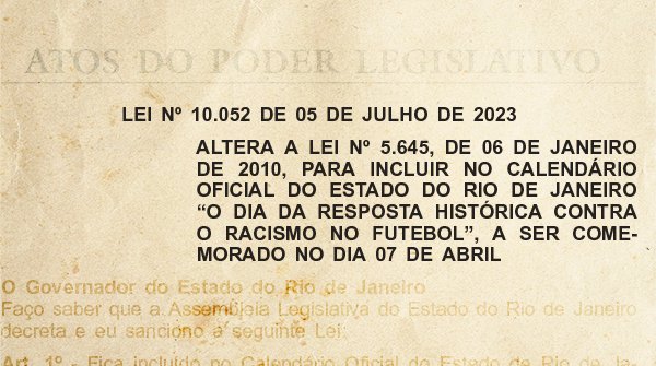 O Estado do Rio de Janeiro instituiu o “Dia da Resposta Histórica Contra o Racismo no Futebol”. A Lei 10.052 de 05 de julho de 2023, publicada hoje no Diário Oficial, estabelece o dia 07 de abril como o dia de combate ao racismo no futebol, em referência ao ofício n.º 261 emitido pelo Club de Regatas Vasco da Gama, em 07 de abril de 1924, eternizado como a “Resposta Histórica”. Esse ofício afirmava a desistência do Vasco em participar da Associação Metropolitana de Esportes Athleticos (AMEA) devido à exigência de exclusão de 12 jogadores, os lendários Camisas Negras, todos jogadores negros e brancos de baixa condição social. O Vasco comemora esse ano o Centenário dos Camisas Negras (1923-2023) e seu legado na conquista do Campeonato Carioca e no estabelecimento como um dos maiores clubes do Brasil. A luta contra o racismo no futebol, esporte e sociedade continua, e o Vasco se posiciona como agente atuante nessa luta, convocando seus torcedores a caminhar junto ao clube. O Vasco é o legítimo clube do povo, símbolo da união entre povos e uma casa aberta a todas e todos. O Vasco agradece à ALERJ e aos deputados que aprovaram esse novo marco no calendário do Rio de Janeiro. Viva o “Dia da Resposta Histórica”!