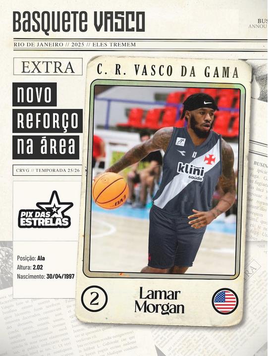 O Vasco anunciou dois reforços estrangeiros para temporada 2025/26 do NBB CAIXA. O ala Lamar Morgan e o armador Lamonte Bearden, ambos norte-americanos, chegam ao Gigante do Basquete com a missão de elevar o nível técnico do elenco e tornar a equipe mais competitiva no cenário nacional.