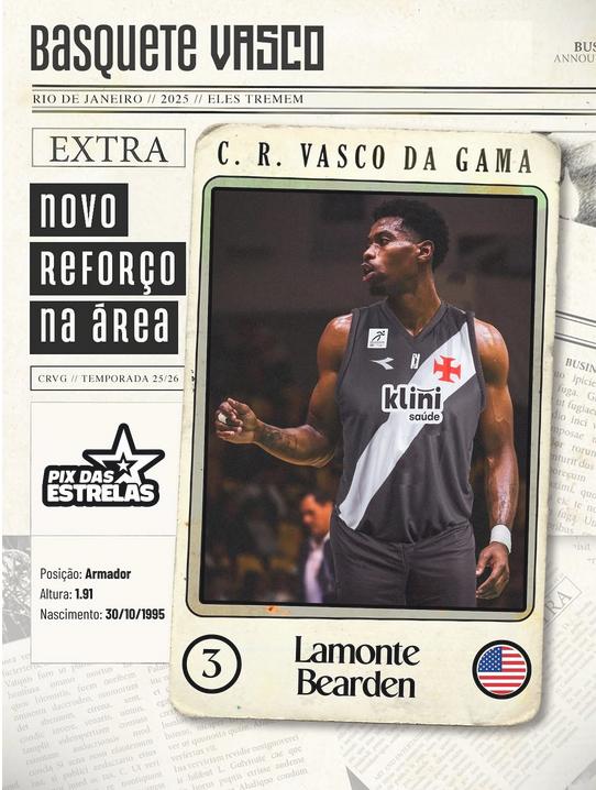 Na sequência, o Vasco também anunciou a chegada do armador Lamonte Bearden, natural de Milwaukee. O jogador vinha atuando na República Dominicana, onde apresentou números consistentes: 13,5 pontos, 3,7 rebotes e 4,7 assistências por jogo, mostrando controle de ritmo e capacidade de liderança dentro de quadra.
