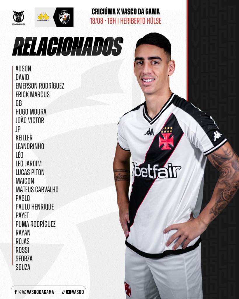 Prestes a enfrentar o Criciúma pelo Campeonato Brasileiro neste domingo (18), às 16h, no estádio Heriberto Hulse, o Vasco divulgou a lista de relacionados com a ausência do atacante Vegetti, que não treinou durante a semana, pois foi preservado pela comissão técnica após sentir dores no clássico contra o Fluminense, no último sábado (10).