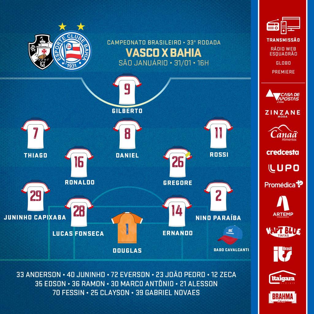 Escalações disponíveis! Confira os times de Vasco e Bahia para o confronto de logo mais